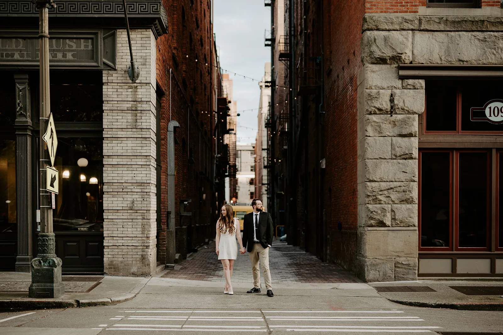 We started in Pioneer Square, one of Seattle’s most character-rich neighborhoods. Its historic architecture, textured brick, and understated palette created a striking contrast to the couple’s modern aesthetic.