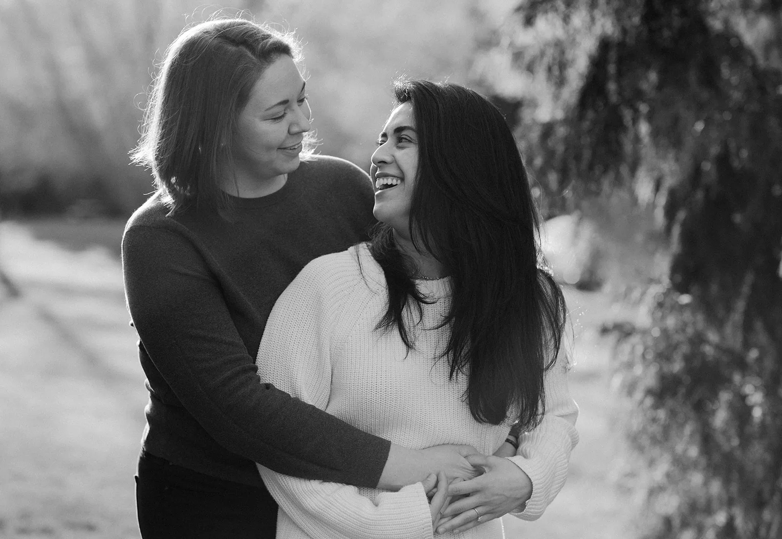 We began by wandering the park’s lush pathways, where towering evergreens and vibrant foliage created a layered, cinematic backdrop. Rather than rushing from one location to the next, we allowed the session to unfold at an unhurried pace. The couple settled naturally into one another, their laughter rising easily as we moved through pockets of light and shadow.