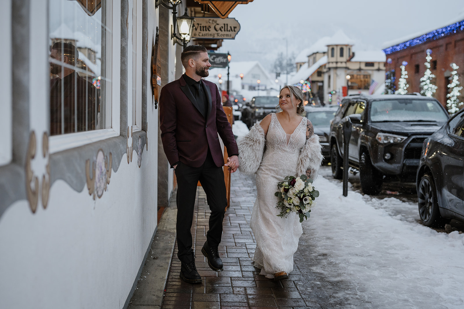 Planning a winter elopement in Leavenworth is a magical experience, though it comes with its challenges. On this particular snowy day, the pass closed right as I made my way through. Winter weddings or elopements in Leavenworth always carry the risk of road closures due to inclement weather. This is why I recommend that couples stay in Leavenworth the night or two before their big day. It’s also wise to secure a room for your photographer the night before your wedding, just in case the pass closes. It would be terrible if they couldn’t get there!