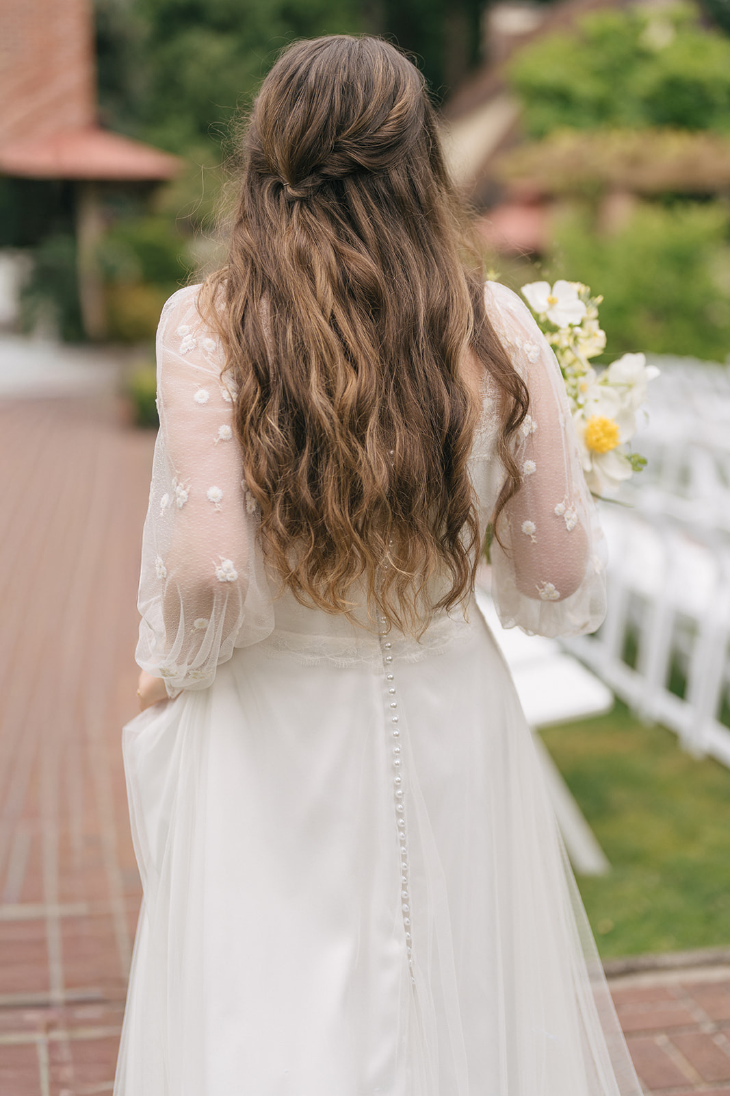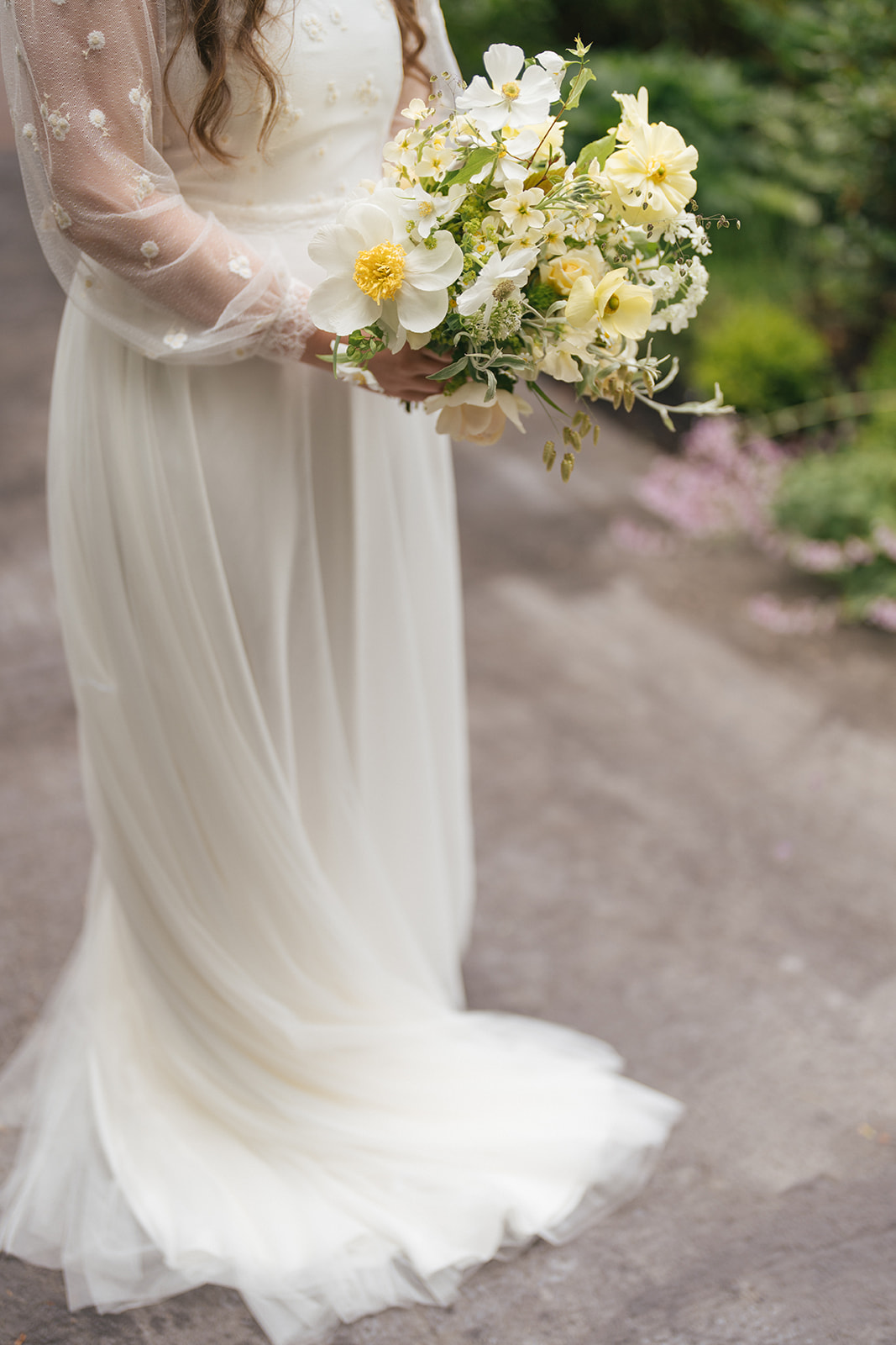 Her bouquet leaned whimsical, blending soft yellows and crisp whites in a fresh, seasonal yet still refined way.