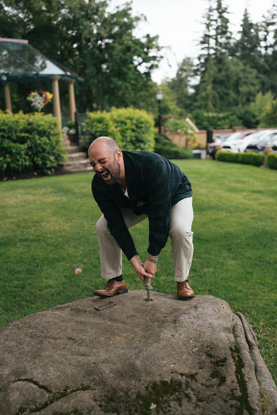Their ceremony unfolded on the back lawn, surrounded by lush landscaping and the steady presence of their closest friends and family. It was the kind of ceremony that held both laughter and tears at once — deeply heartfelt without ever feeling overly formal.