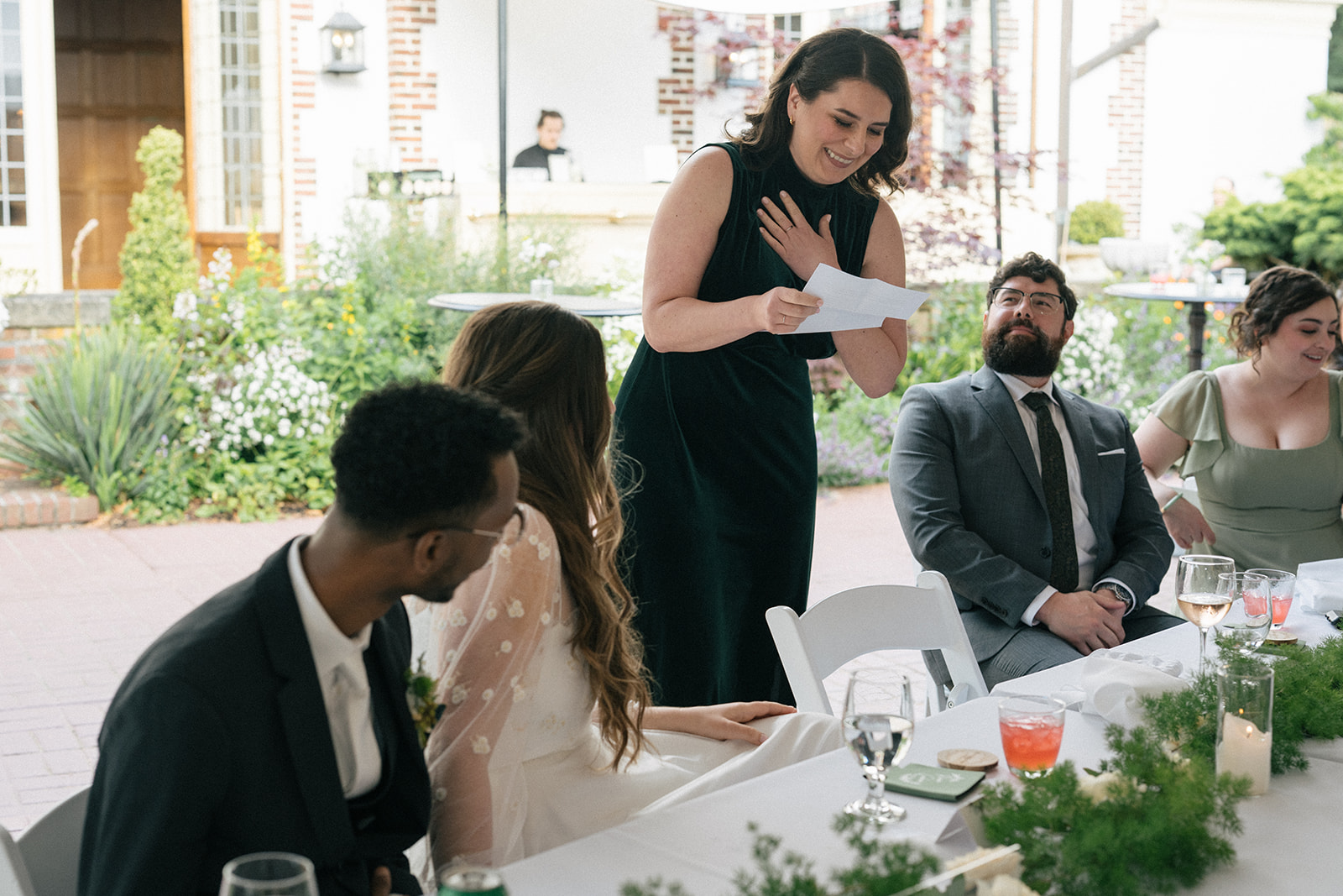 The bridesmaids wore an array of green dresses — varied in tone and style, yet completely cohesive. Together, the palette echoed the grounds in a way that felt intentional without being overly coordinated. It’s a reminder that color choices don’t need to be complicated to be impactful; when they reflect the environment, everything naturally falls into place.