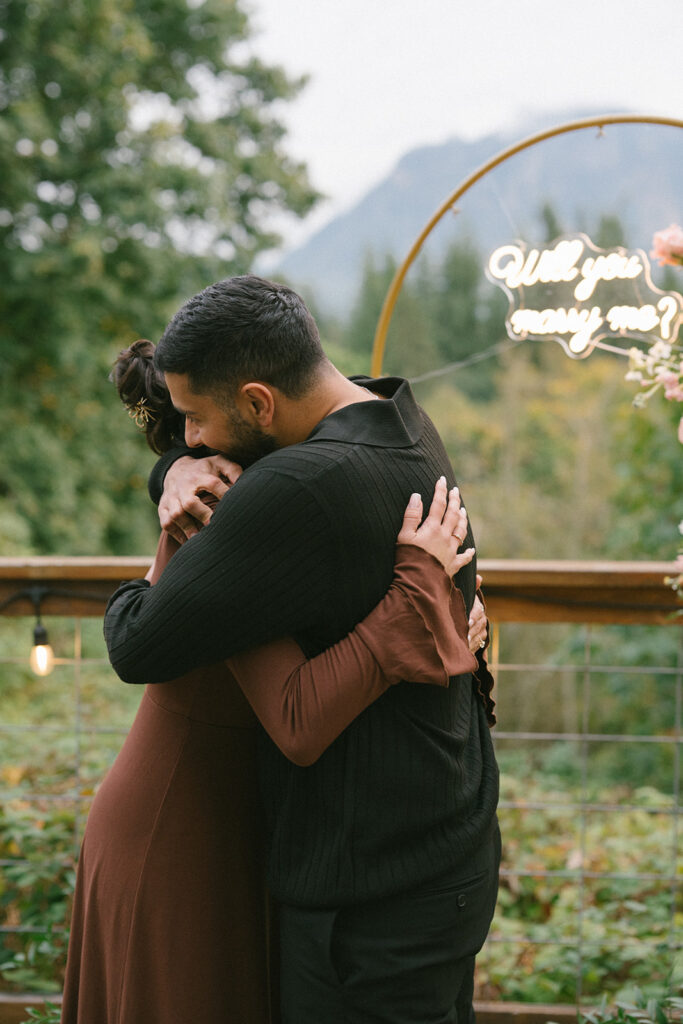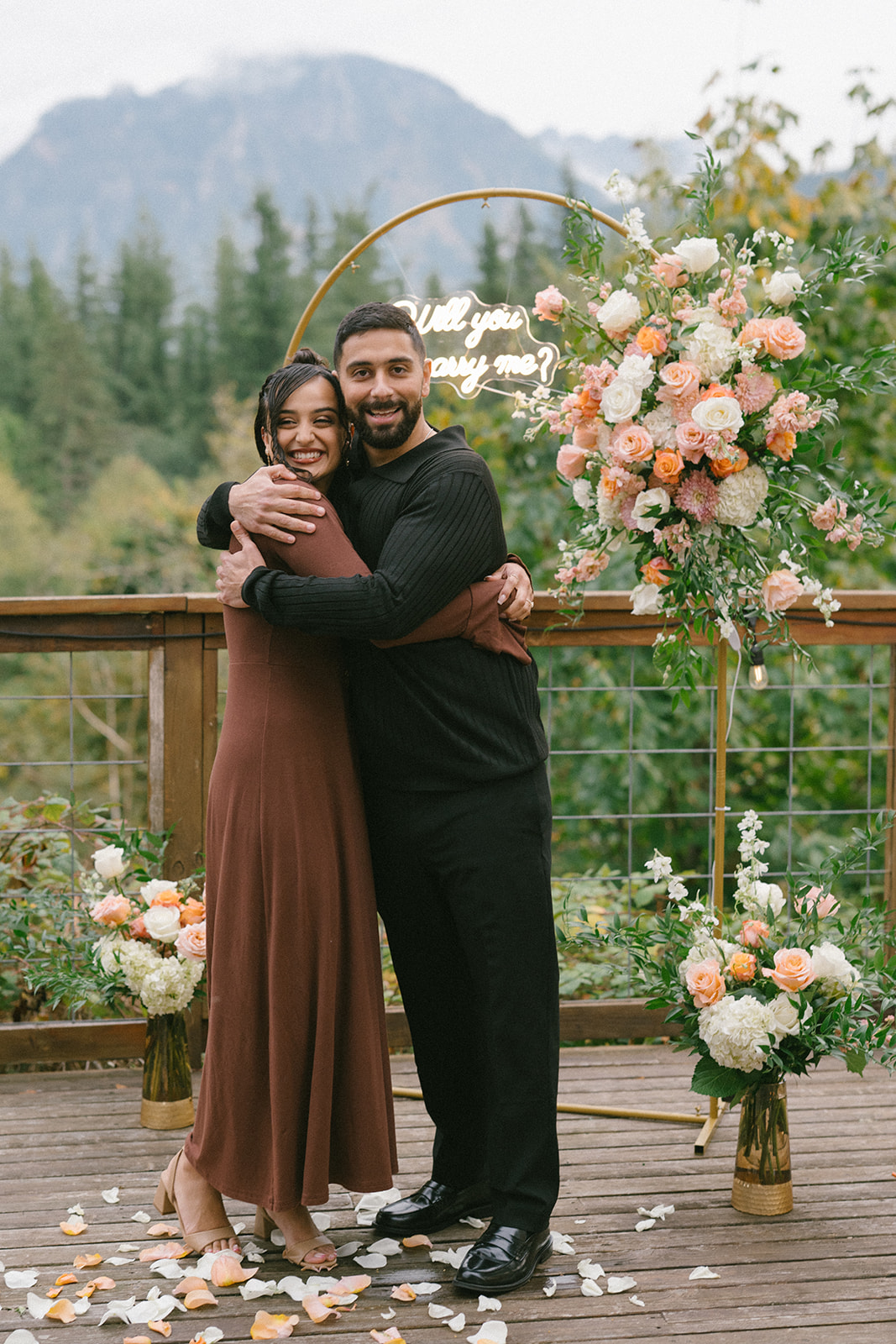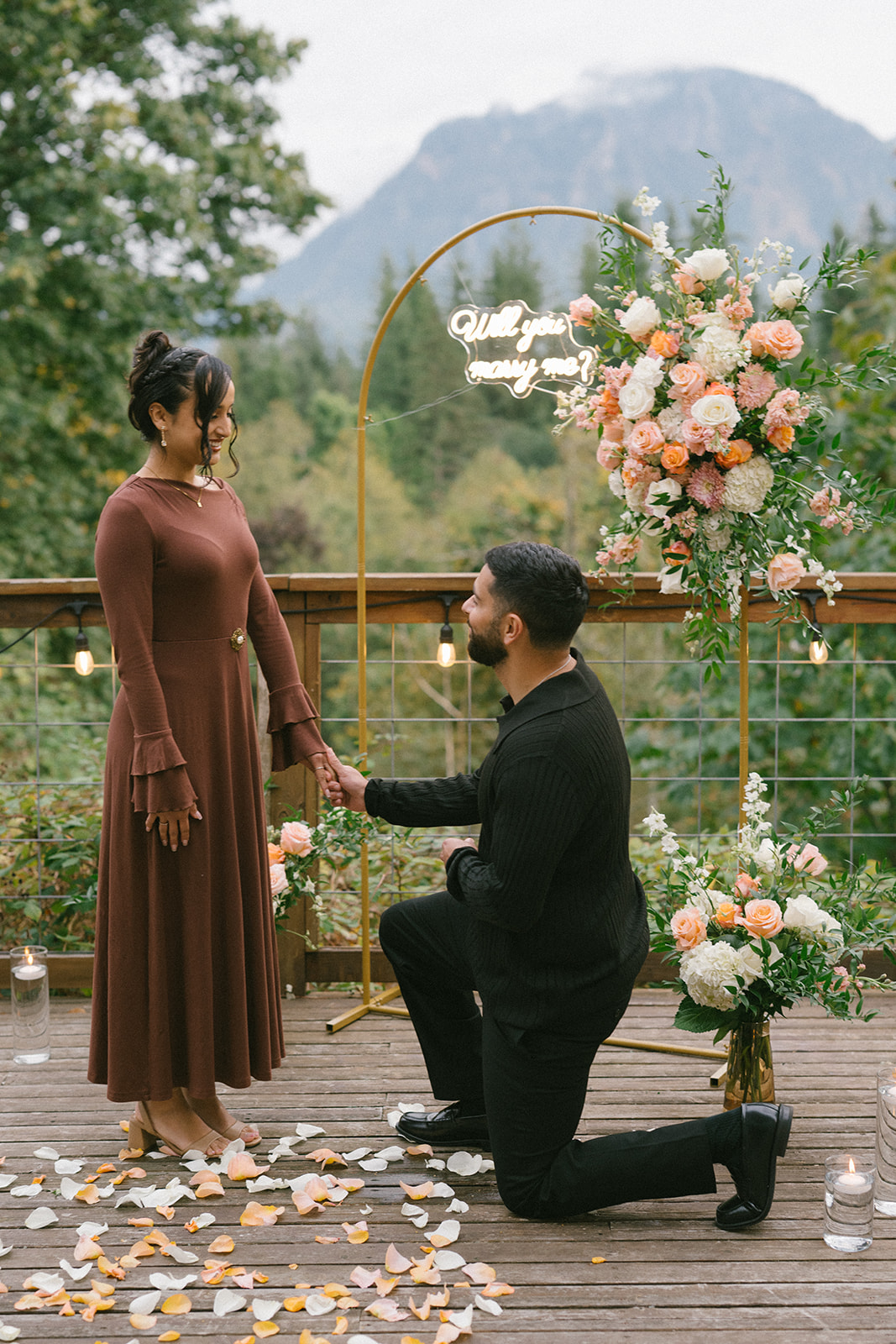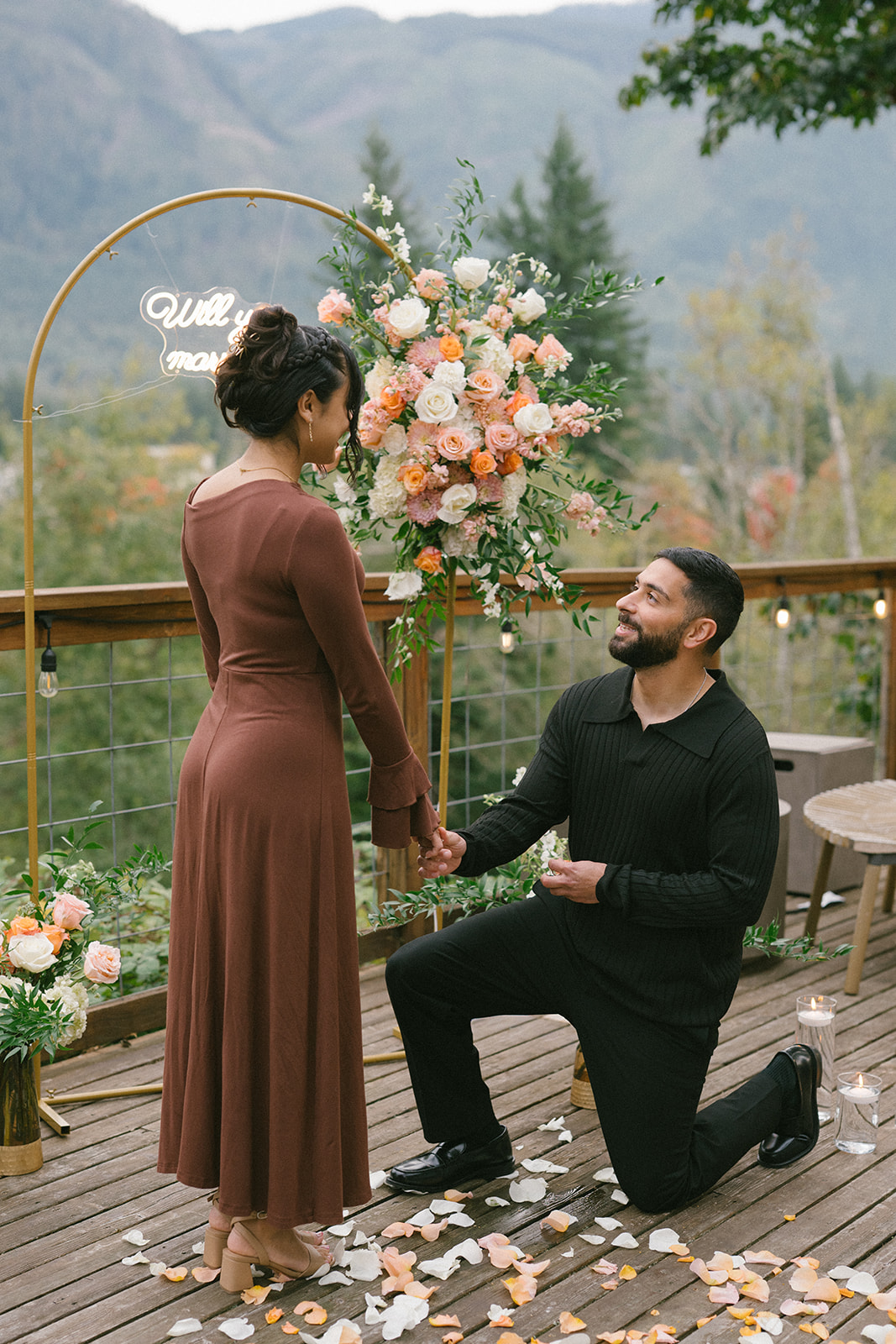 To bring his vision to life, Hamid hired a florist to design a stunning floral arch for the proposal. The arch framed the mountain view and transformed the deck into a romantic, intentional space. Lush florals, soft colors, and thoughtful placement created a focal point that felt both elegant and natural against the rugged Pacific Northwest landscape. I always love when someone puts this level of care into a proposal, because it shows how much thought they’ve given to creating a moment that feels truly special for their partner.