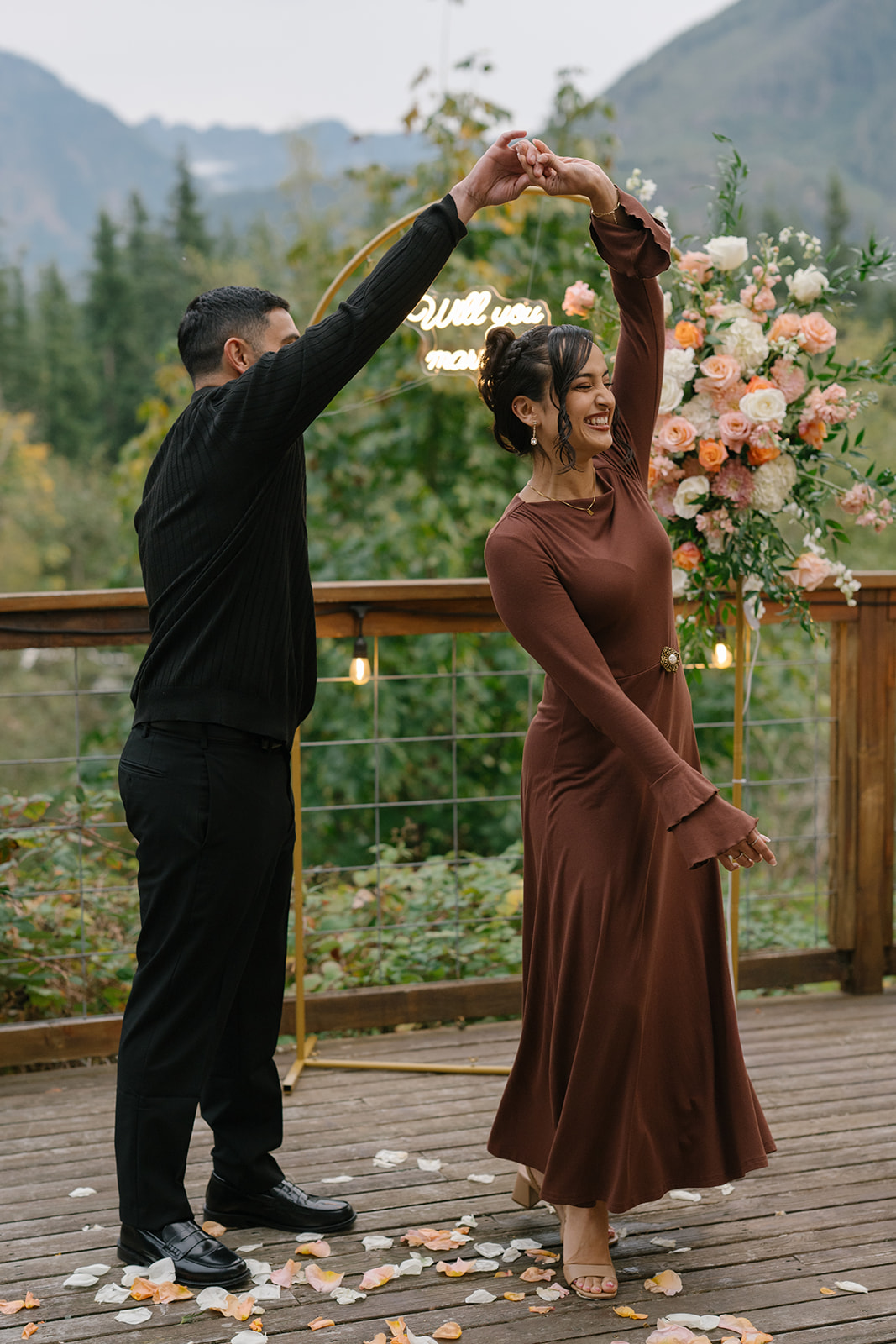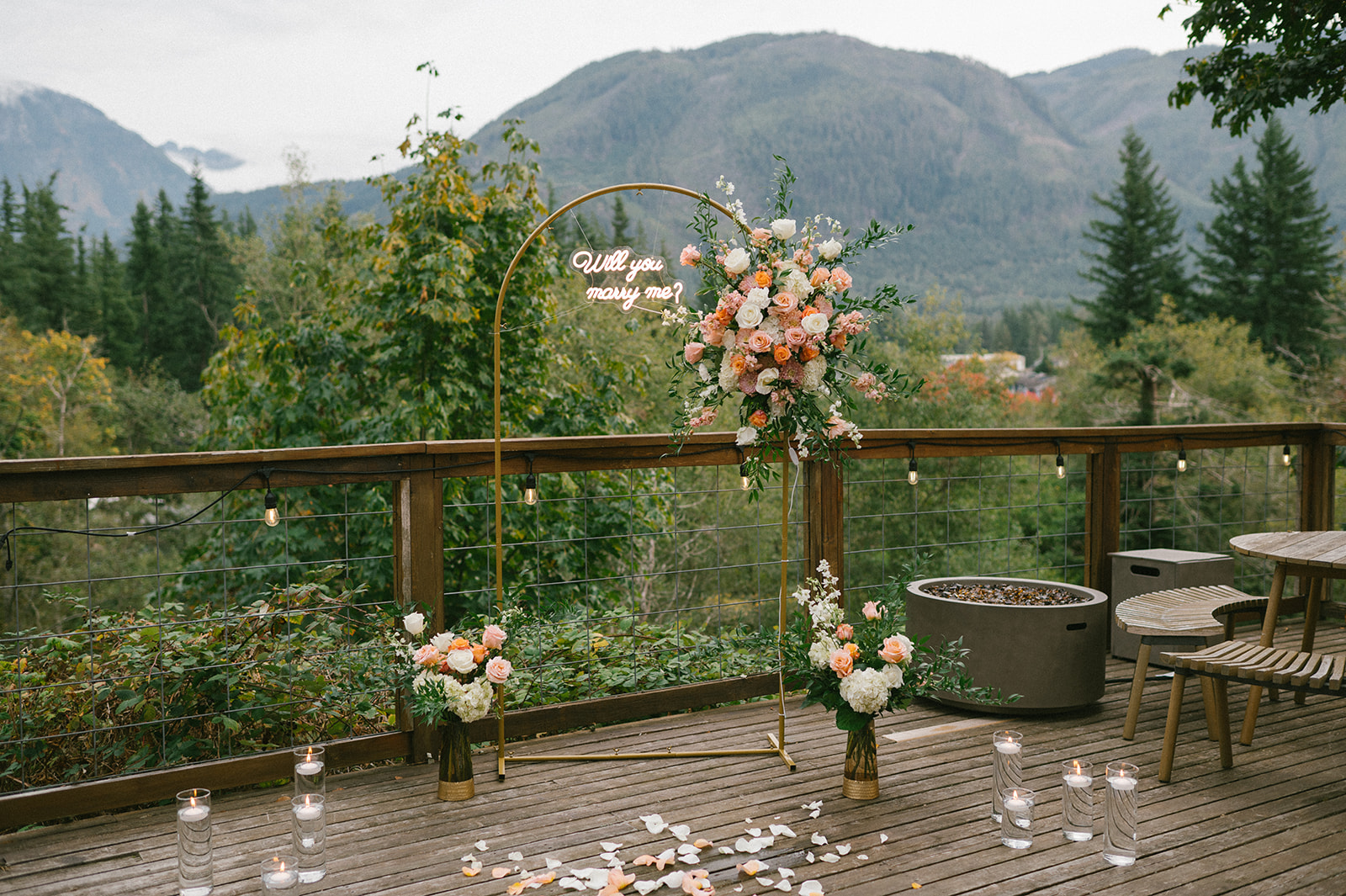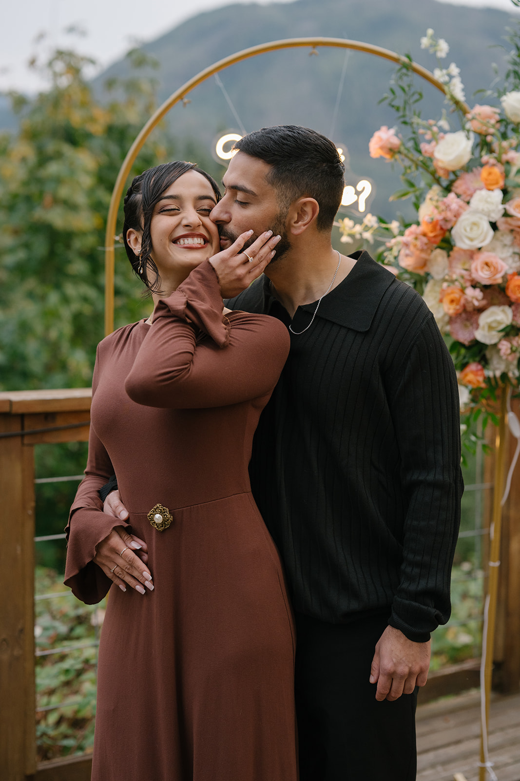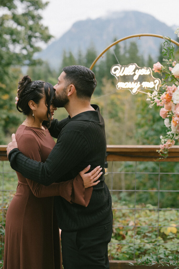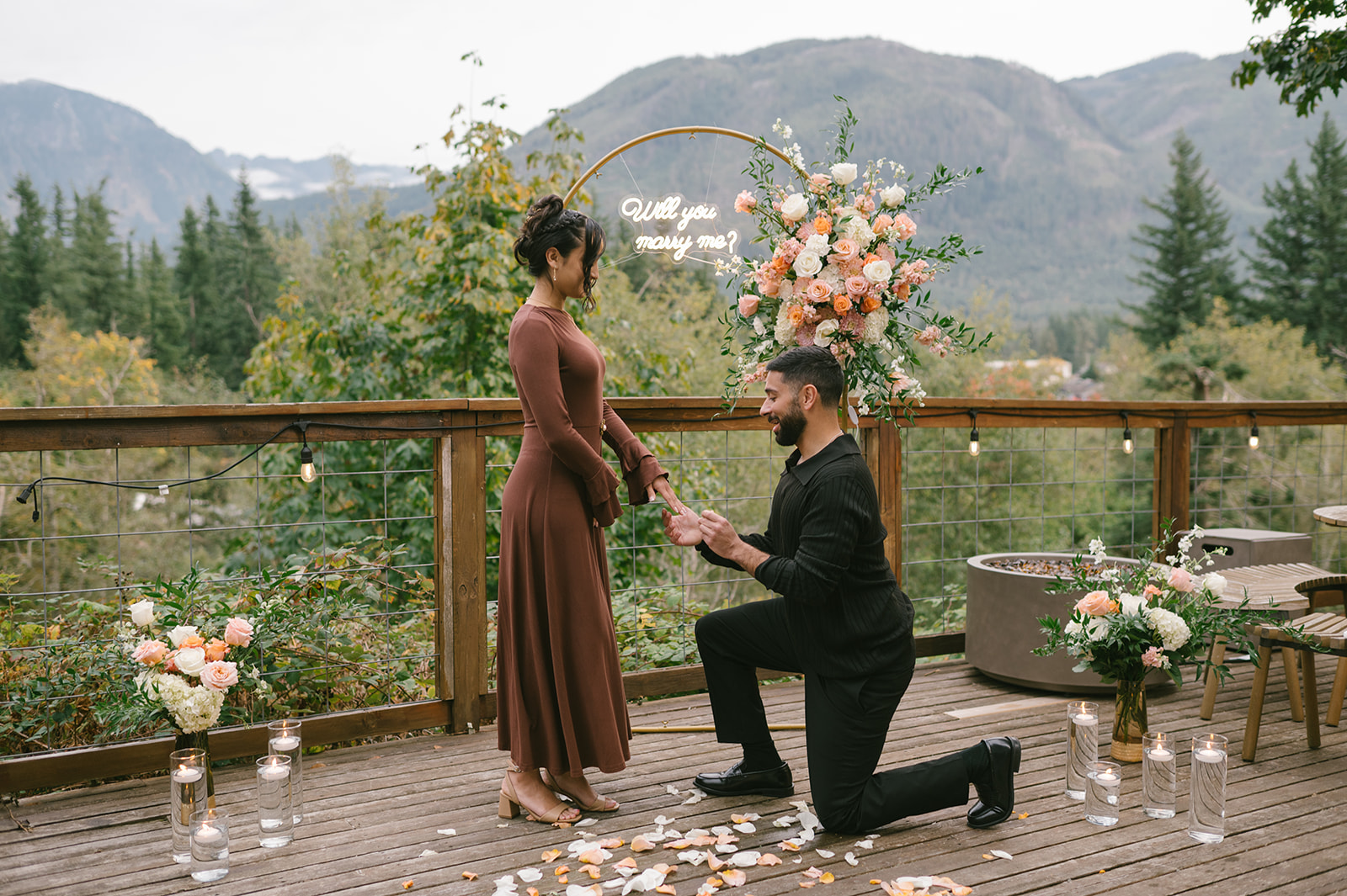 To bring his vision to life, Hamid hired a florist to design a stunning floral arch for the proposal. The arch framed the mountain view and transformed the deck into a romantic, intentional space. Lush florals, soft colors, and thoughtful placement created a focal point that felt both elegant and natural against the rugged Pacific Northwest landscape. I always love when someone puts this level of care into a proposal, because it shows how much thought they’ve given to creating a moment that feels truly special for their partner.