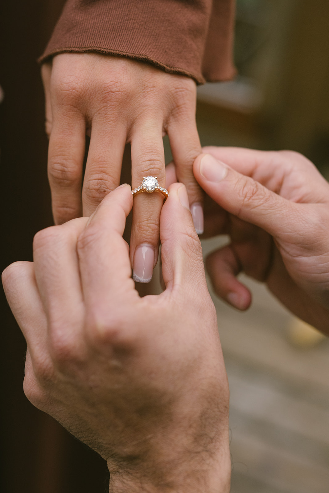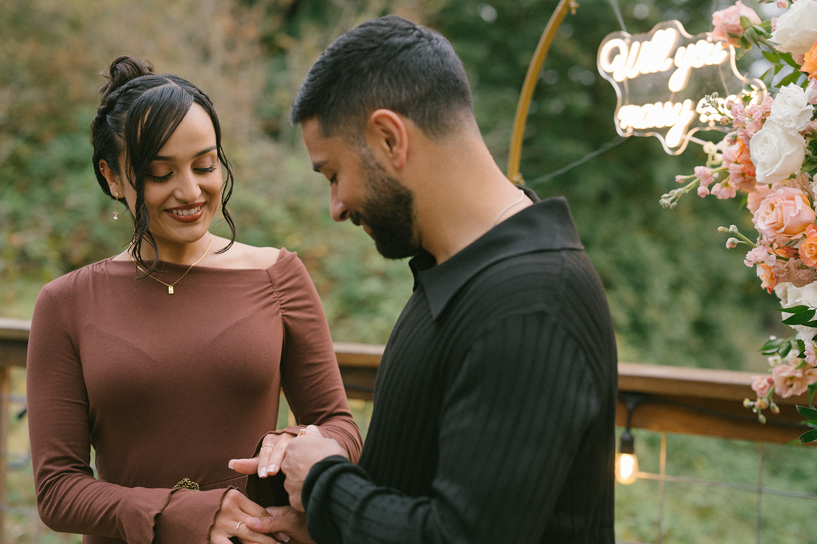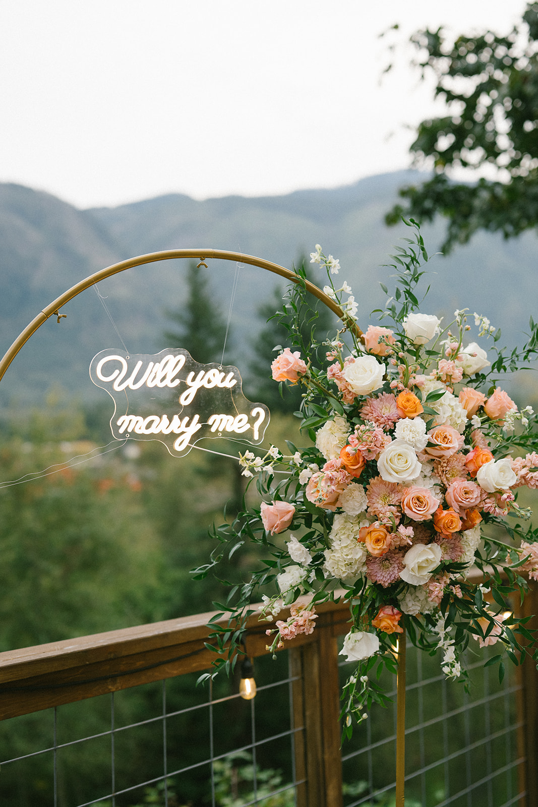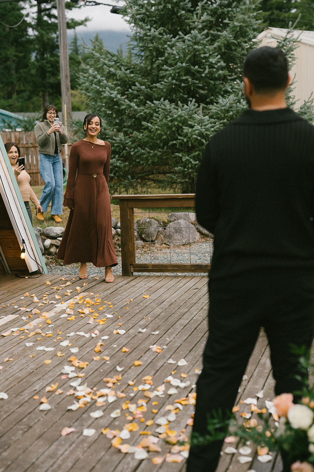 To bring his vision to life, Hamid hired a florist to design a stunning floral arch for the proposal. The arch framed the mountain view and transformed the deck into a romantic, intentional space. Lush florals, soft colors, and thoughtful placement created a focal point that felt both elegant and natural against the rugged Pacific Northwest landscape. I always love when someone puts this level of care into a proposal, because it shows how much thought they’ve given to creating a moment that feels truly special for their partner.