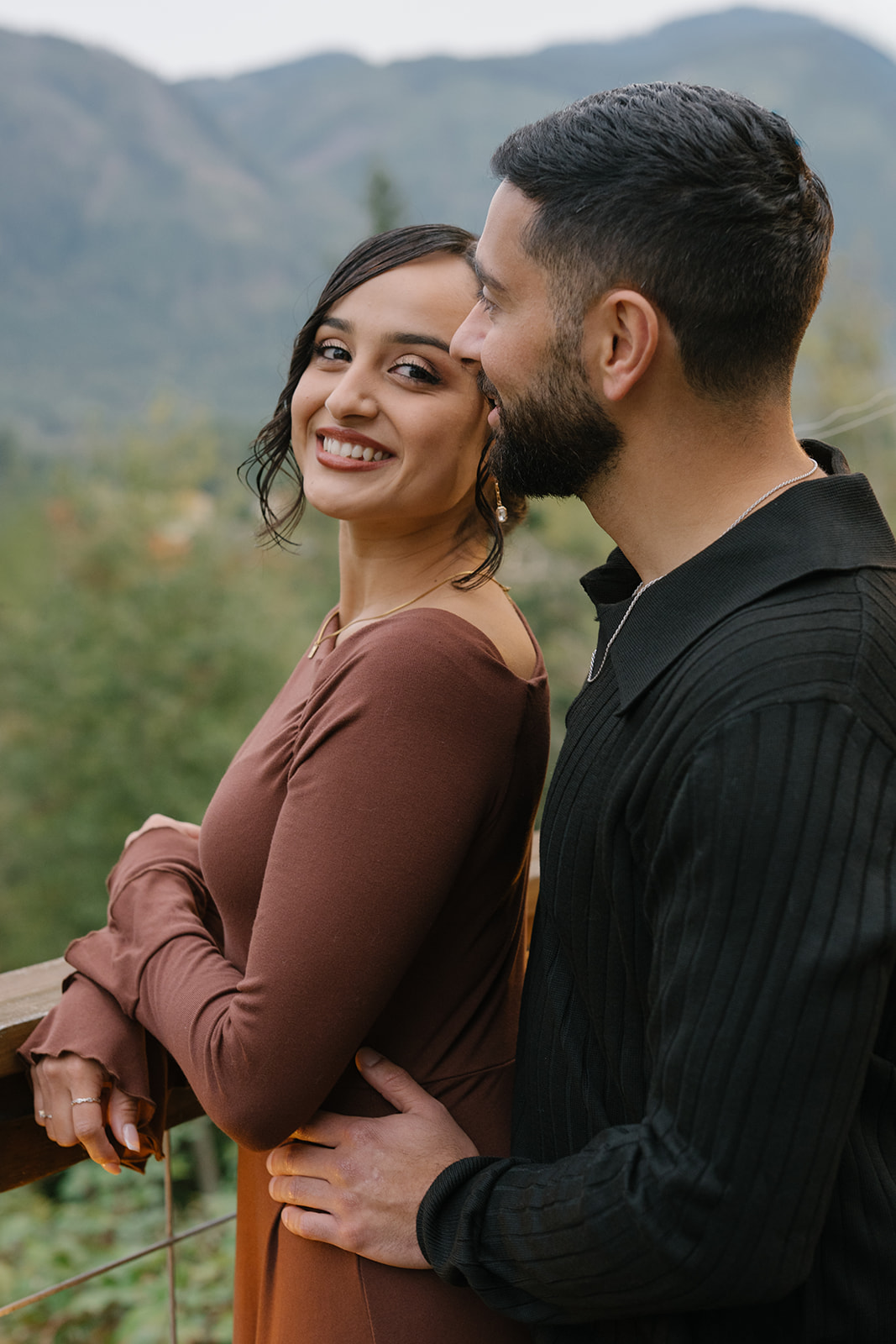 Because Abregail has always felt most at home in the mountains, we searched for a location that offered sweeping views and quiet privacy. While we considered scenic overlooks and trails, we ultimately chose an Airbnb in Index, Washington. The back deck provided the perfect mountain backdrop while allowing the proposal to remain intimate and uninterrupted. The surrounding peaks, evergreen trees, and soft overcast light created a setting that felt both peaceful and dramatic.