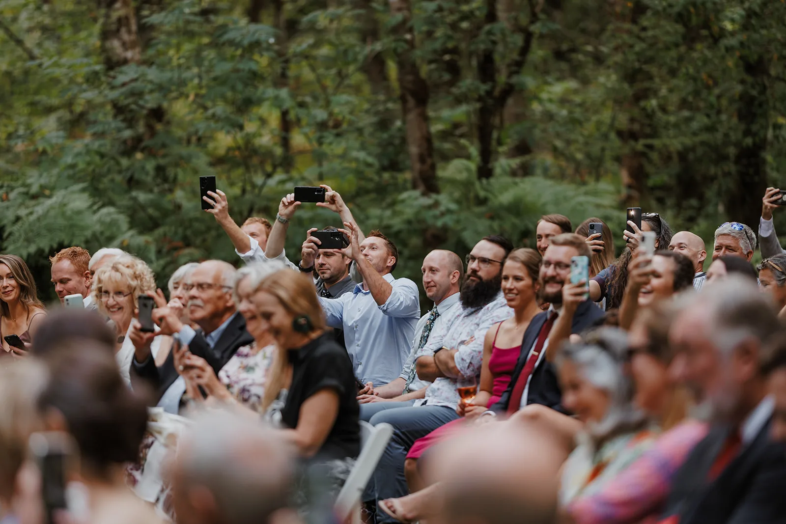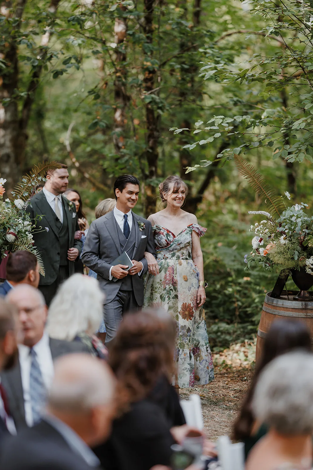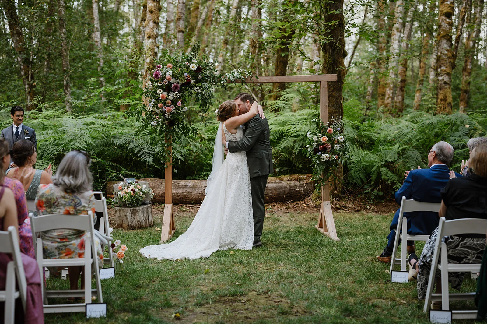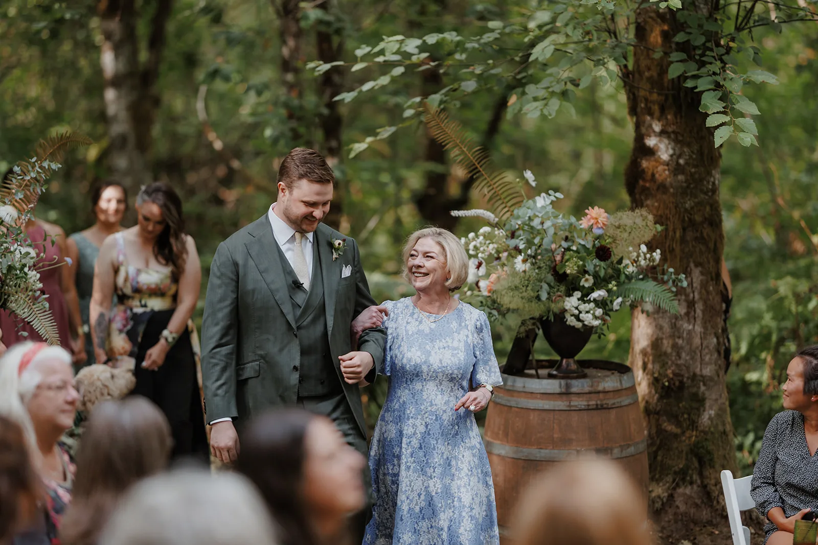 One of my favorite parts about capturing a wedding at Carson Creek Estate is the intimate, almost magical feel of the ceremony space. After cocktail hour, guests walked along a gently winding woodland path, enveloped by towering trees and lush greenery, toward the ceremony site. This forest hollow area is one of the venue’s most unique features, offering a natural and enchanting backdrop for exchanging vows.