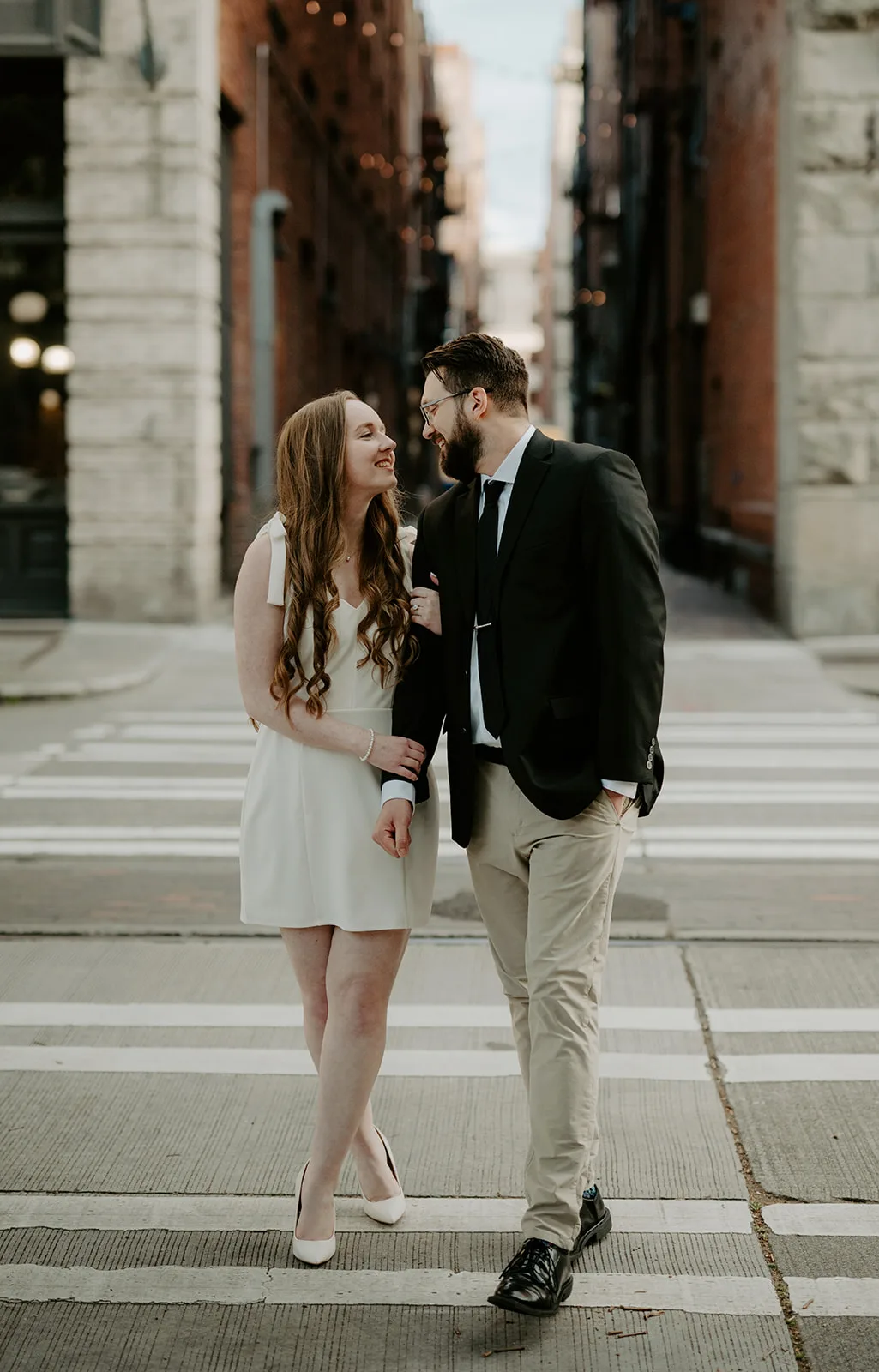 We started in Pioneer Square, one of Seattle’s most character-rich neighborhoods. Its historic architecture, textured brick, and understated palette created a striking contrast to the couple’s modern aesthetic.