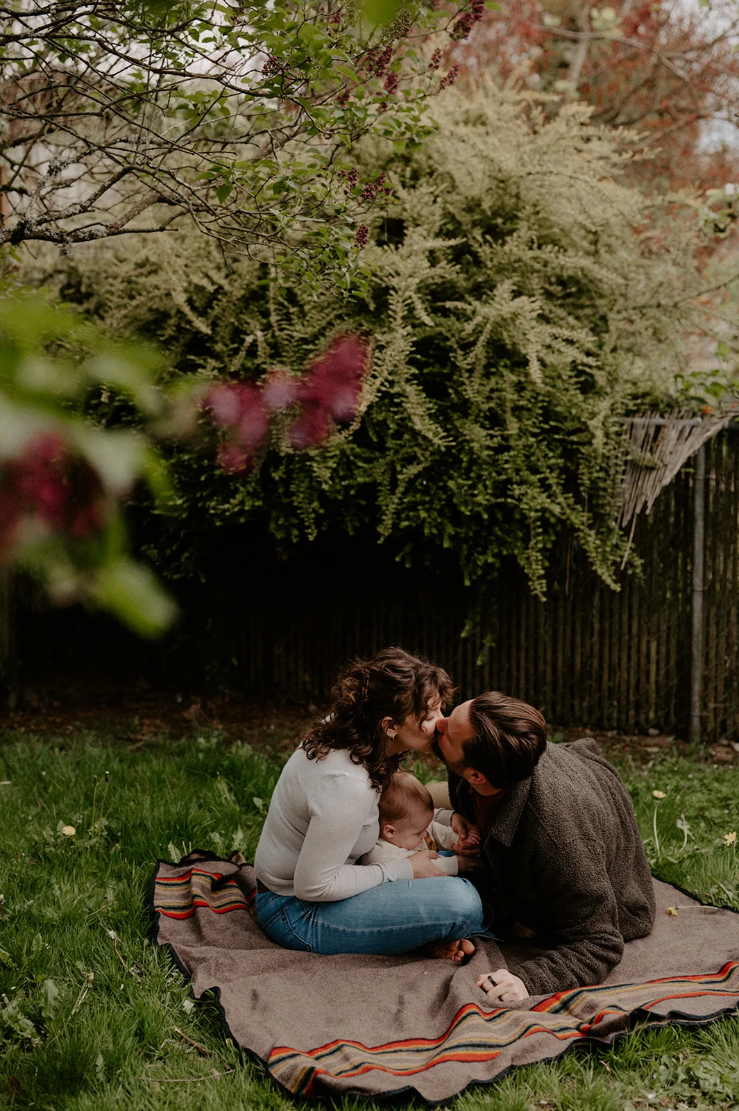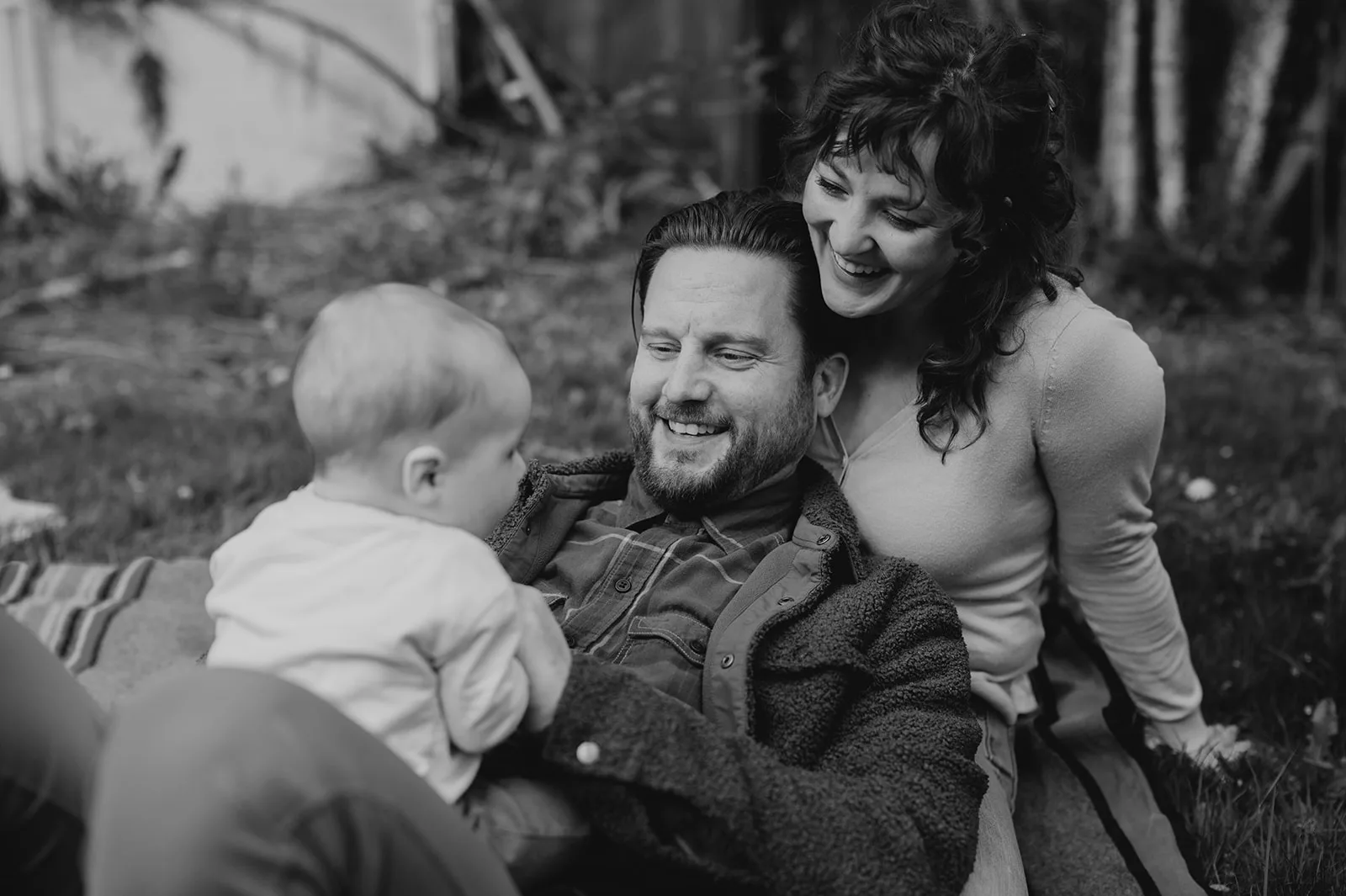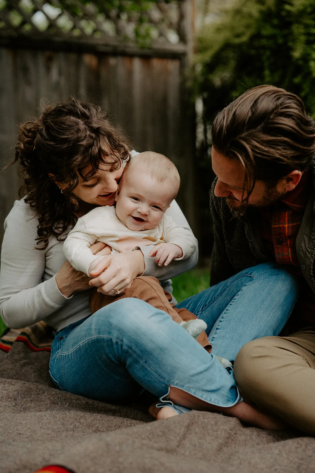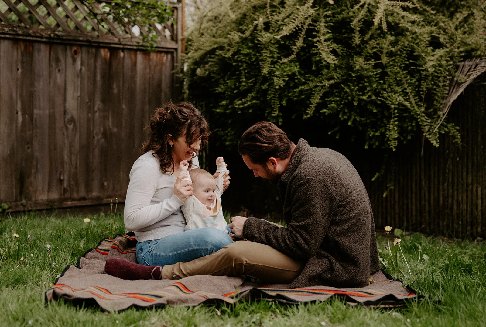 Next, we ventured outside to their backyard. The afternoon light was perfect, casting a soft glow over the scene. J and M’s backyard is a tranquil oasis, ideal for an in-home lifestyle family session. They played with their baby on a blanket, surrounded by the beauty of nature. These moments were incredibly heartwarming, showcasing family life’s simple yet profound joy.