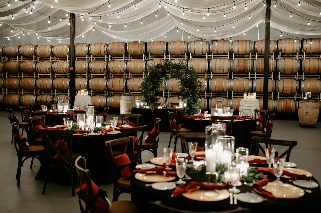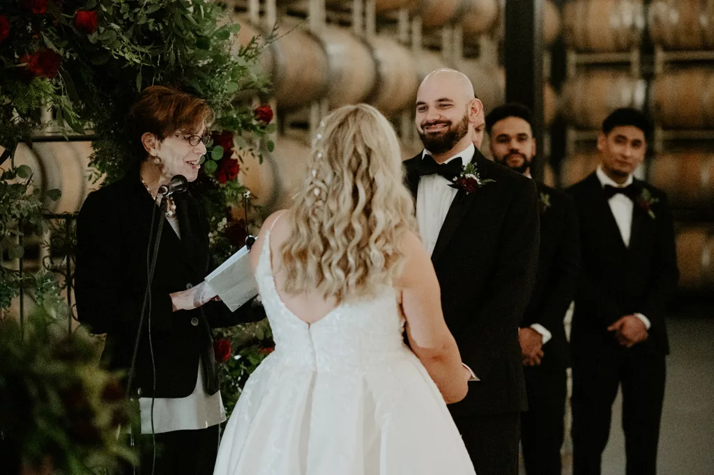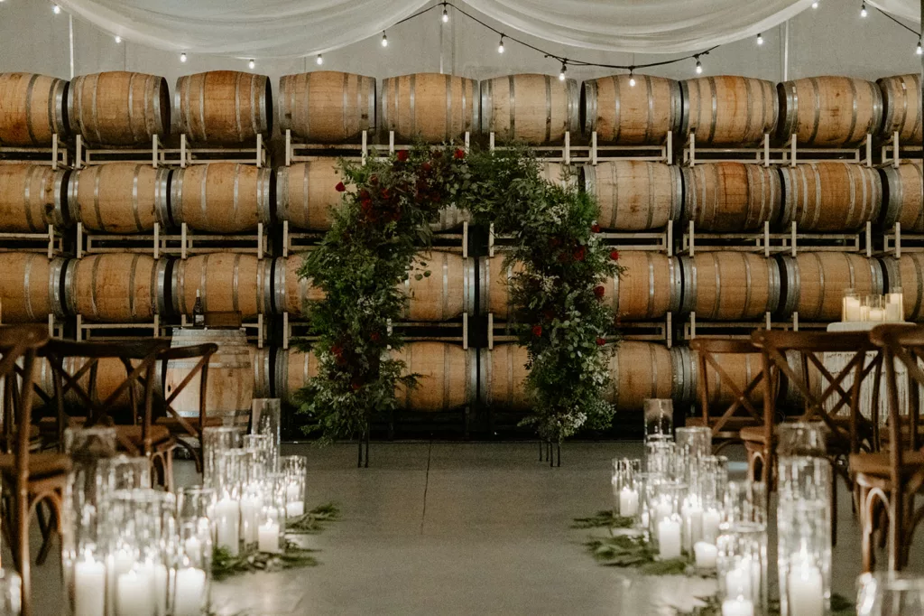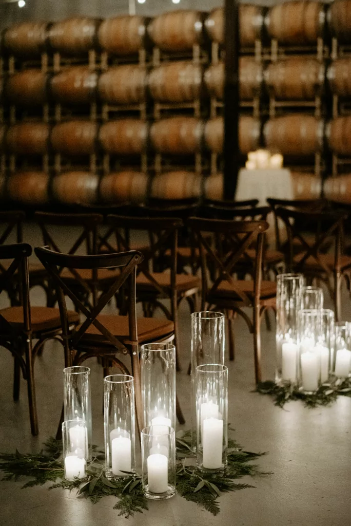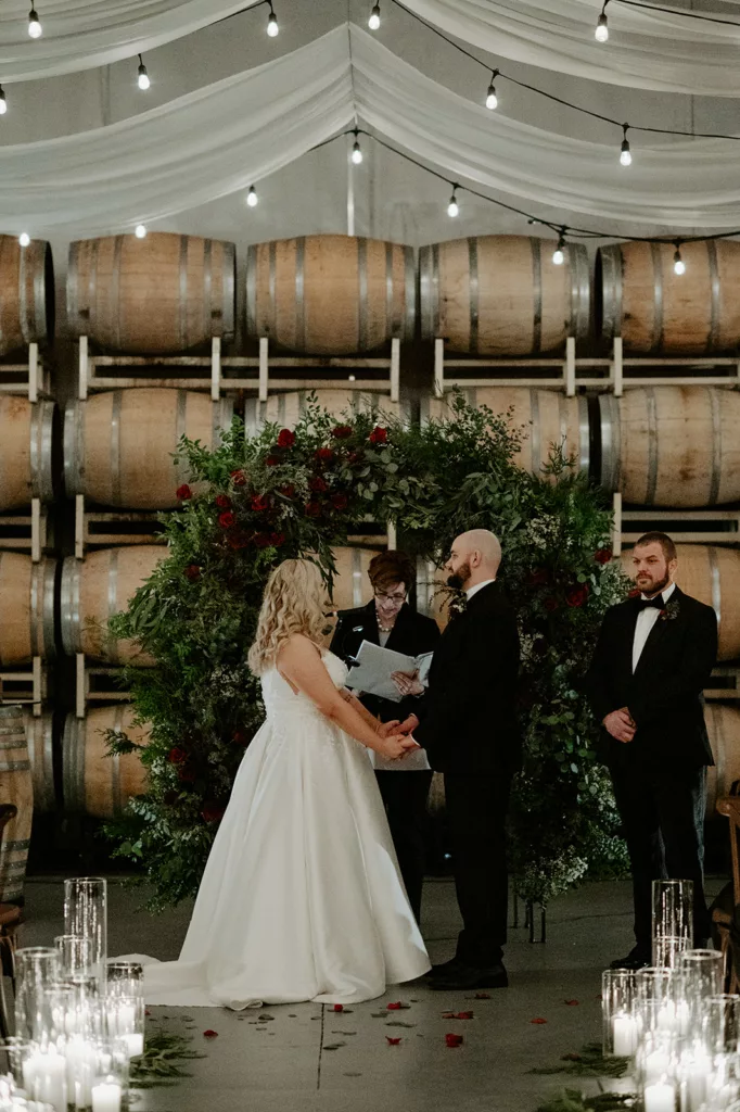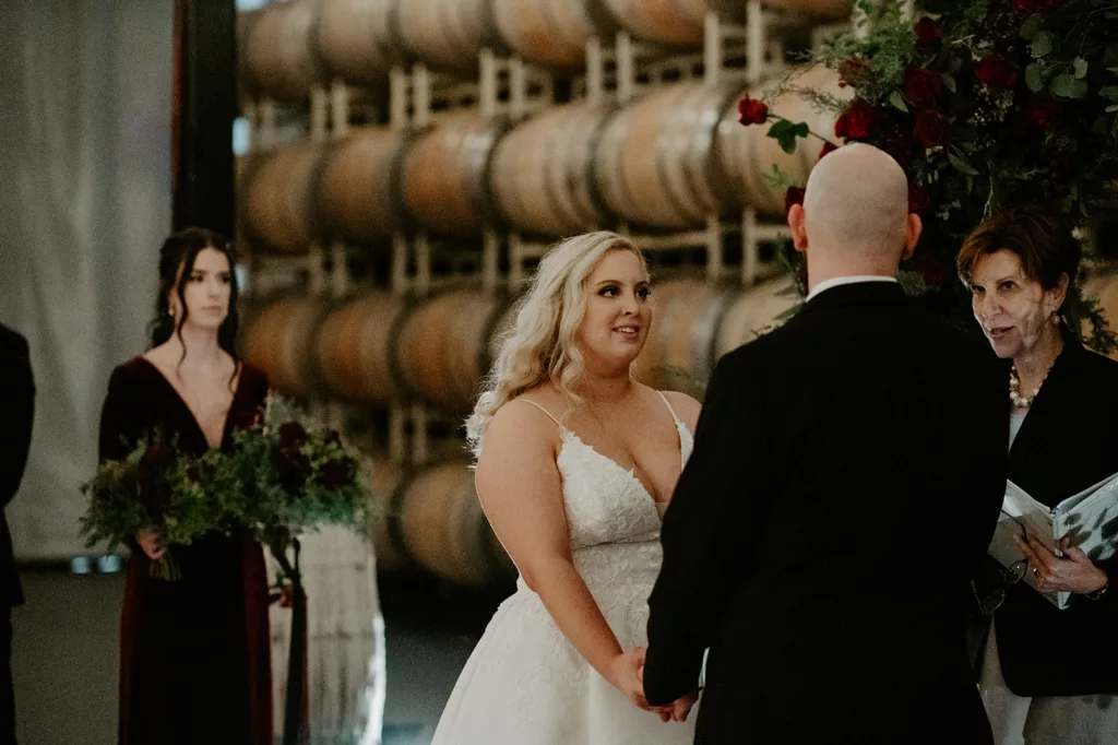 The subdued lighting in the barrel room added to the cozy ambiance and created a romantic atmosphere. This ceremony, lit only by candlelight, made the moment even more special and intimate. The most touching moment was when the couple’s daughter asked to be held during their vows.