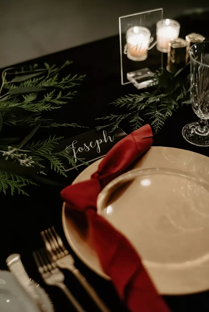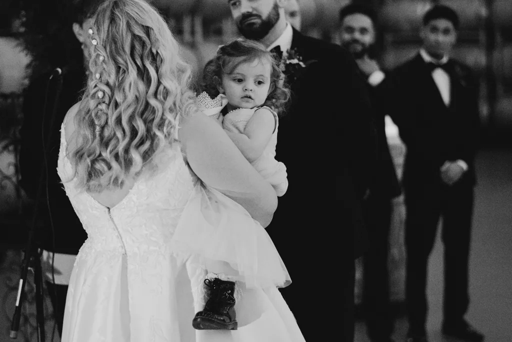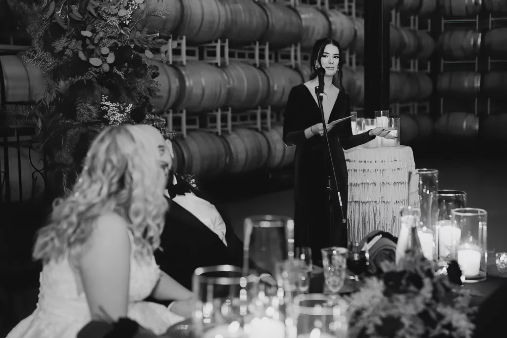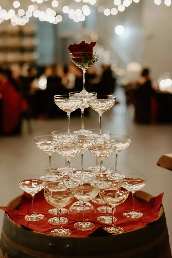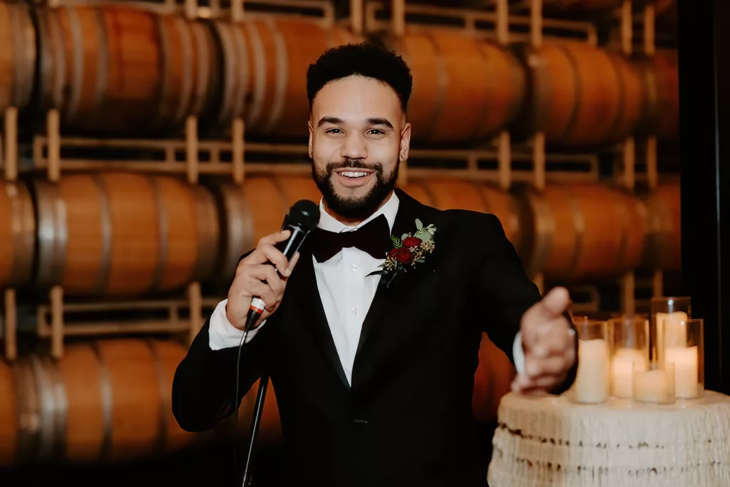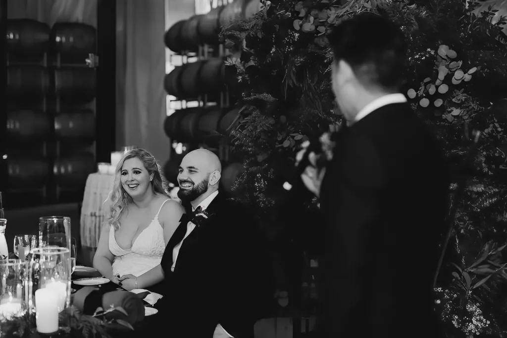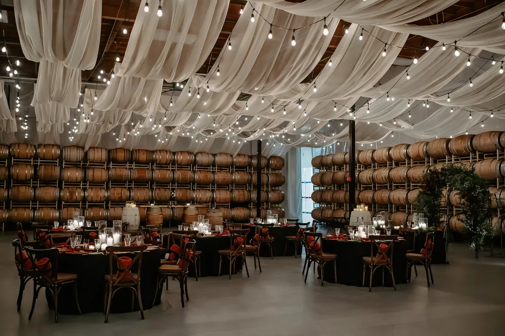 The subdued lighting in the barrel room added to the cozy ambiance and created a romantic atmosphere. This ceremony, lit only by candlelight, made the moment even more special and intimate. The most touching moment was when the couple’s daughter asked to be held during their vows.