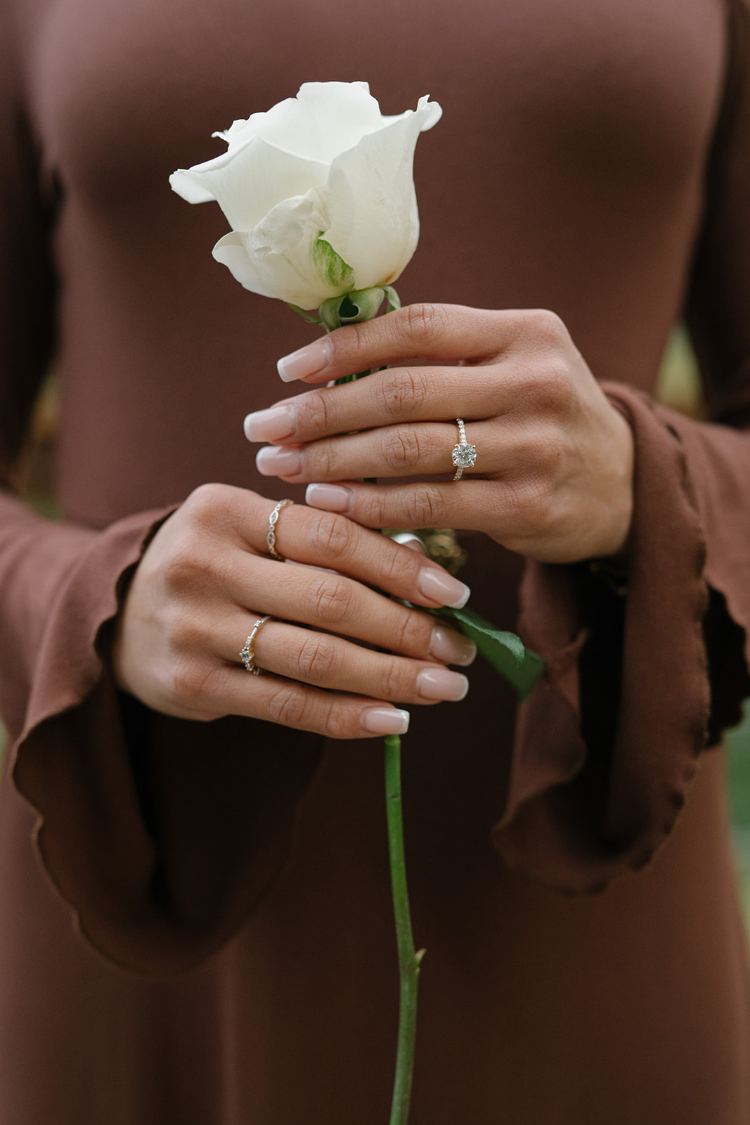 Because Abregail has always felt most at home in the mountains, we searched for a location that offered sweeping views and quiet privacy. While we considered scenic overlooks and trails, we ultimately chose an Airbnb in Index, Washington. The back deck provided the perfect mountain backdrop while allowing the proposal to remain intimate and uninterrupted. The surrounding peaks, evergreen trees, and soft overcast light created a setting that felt both peaceful and dramatic.