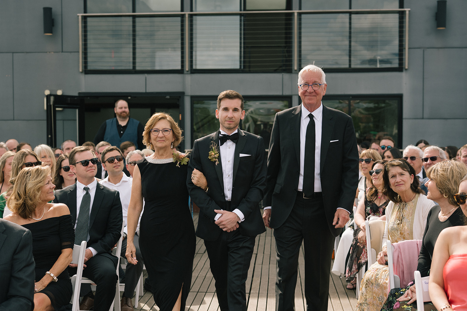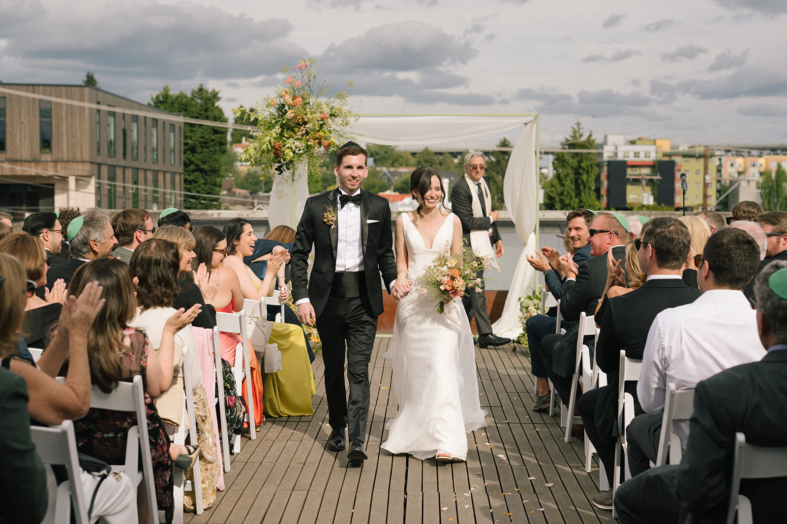 By early evening, guests gathered on the Foundry’s rooftop beneath expansive blue skies. Few ceremony spaces offer the same balance of grandeur and intimacy. Sweeping views of Lake Union stretched outward while the iconic Fremont Bridge added a sense of place unmistakably tied to Seattle.